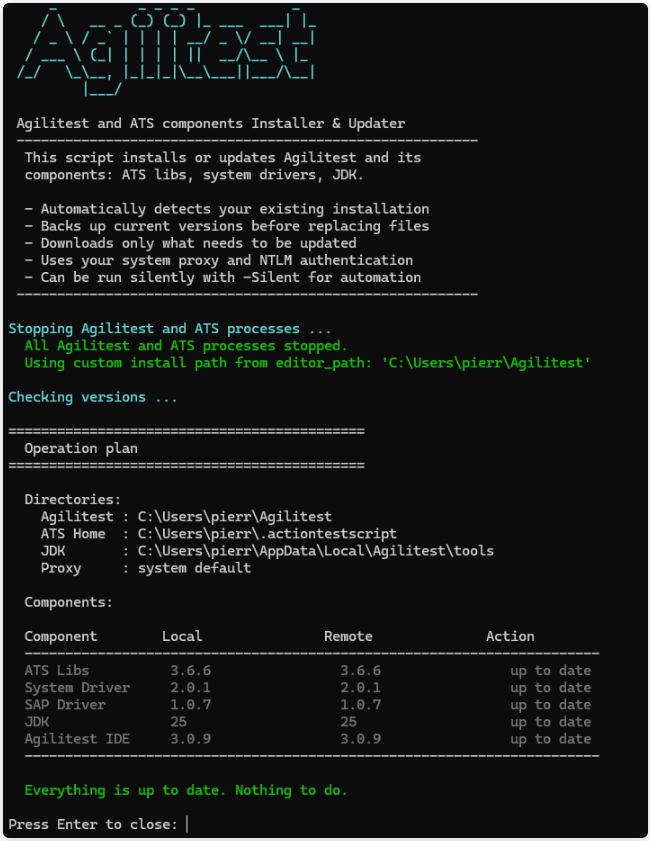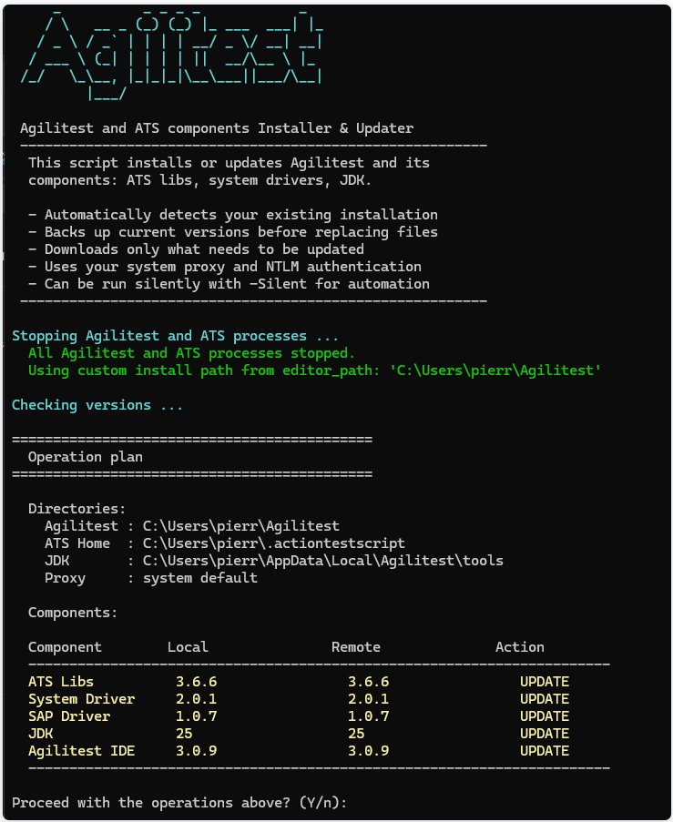 Before any install or update, the script stops all running Agilitest and ATS processes: agilitest, windowsdriver, sapdriver, browser drivers (chromedriver, geckodriver, msedgedriver, operadriver, bravedriver), ATS workers (awio, awpy, awjs, awsys, awmath, webviewer), and java.exe instances launched by AgilitestEditor.