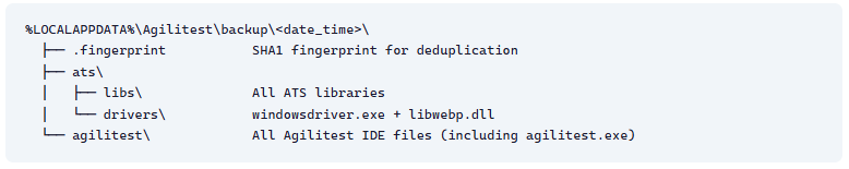.\install-agilitest.ps1 -RestoreThe script displays a numbered list of available backups with their date and content. Select the one to restore and it will replace ATS libs, ATS drivers, and Agilitest IDE files with the backed-up versions.