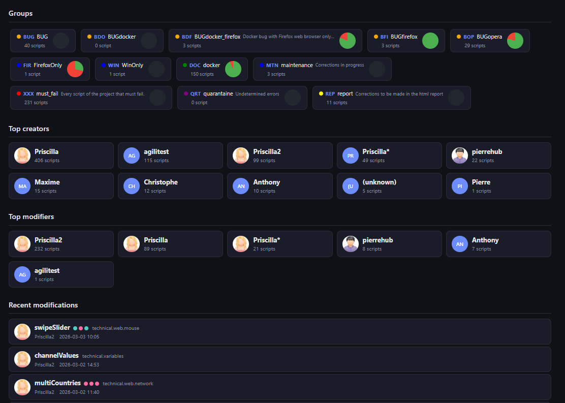 The test results pie chart, recent changes...