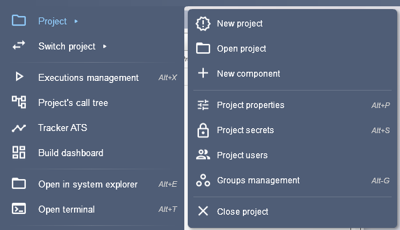 - Project secrets : To open a window with the project's passwords and tokens